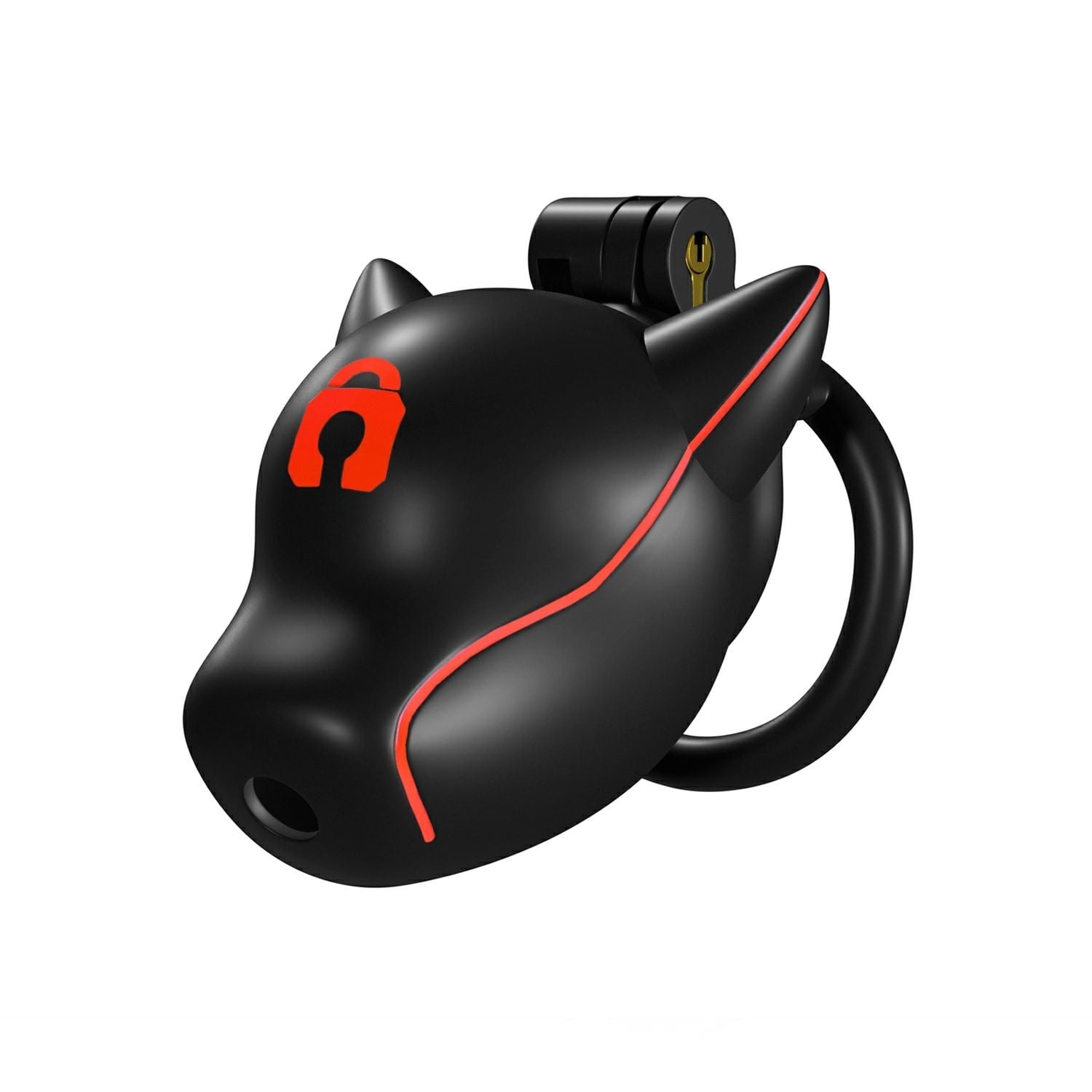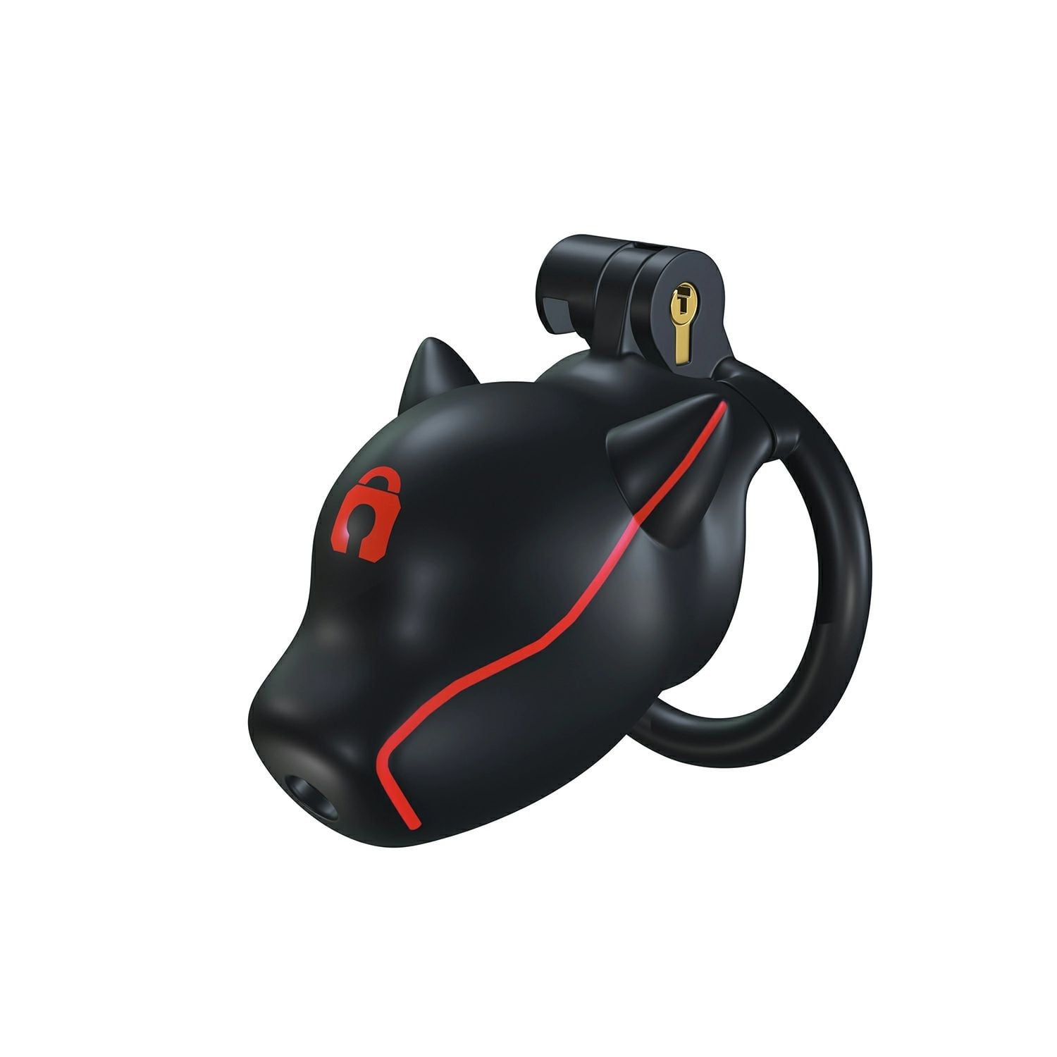 Plastová klietka na penis v tvare psiej hlavy, zdobená výraznými červenými pruhmi a symbolom zámku. K dispozícii v dvoch veľkostiach. Balenie obsahuje samotnú klietku, 4 veľkosti krúžkov, kovový zámok s dvoma kľúčmi a 5 plastových zámkov. Viac informácií