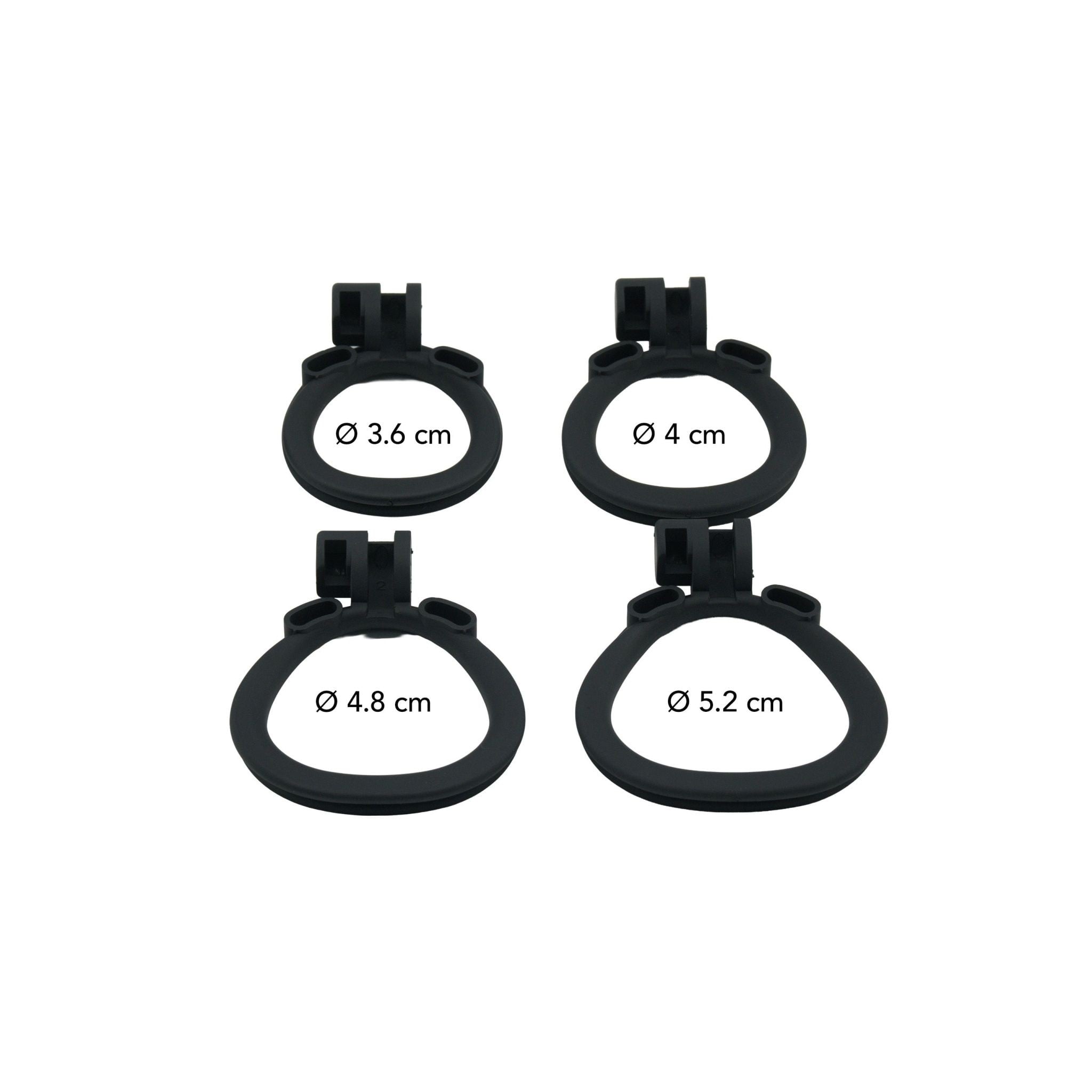 Balenie obsahuje aj 4 veľkosti spojovacích krúžkov, vďaka čomu je možné klietku presne prispôsobiť anatómii nositeľa, aby bola bezpečná, ale pohodlná. Správna veľkosť je kľúčom k bezpečnému noseniu a intenzívnemu zážitku.